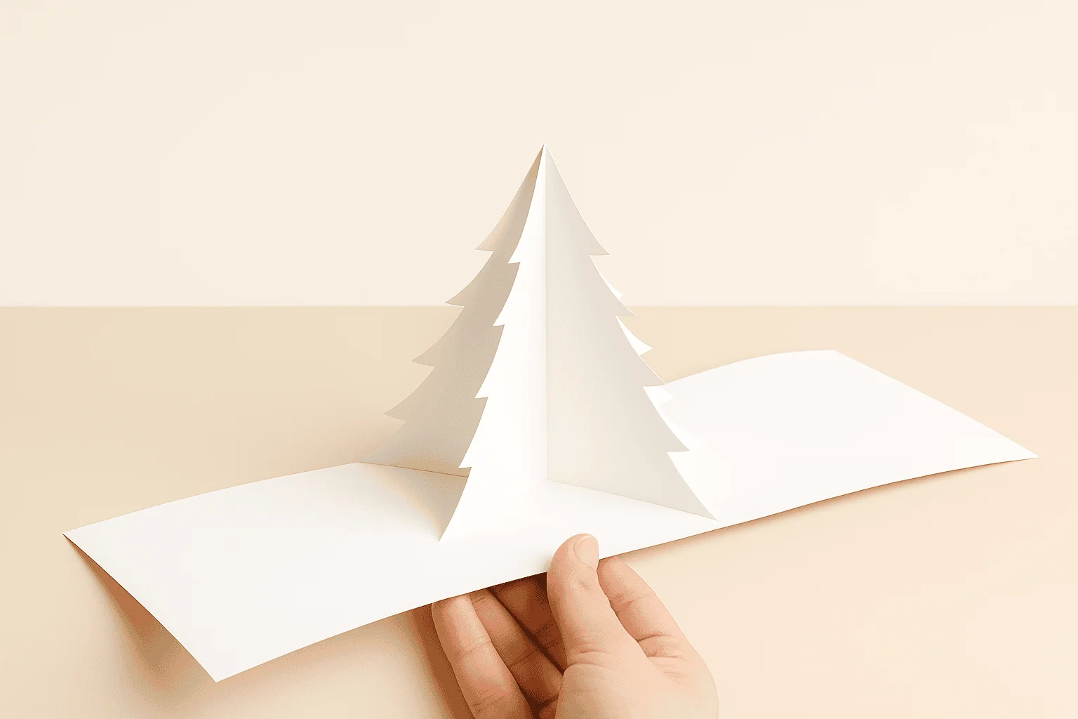 Die 3D-Tannenbaum-Klappkarte nutzt eine spezielle Falttechnik, bei der sich beim Öffnen der Karte ein detaillierter Tannenbaum in 3D entfaltet. Durch präzise gestanzte Elemente und hochwertiges Material entsteht eine interaktive Darstellung, die sofort Aufmerksamkeit erregt und die festliche Stimmung unterstreicht.